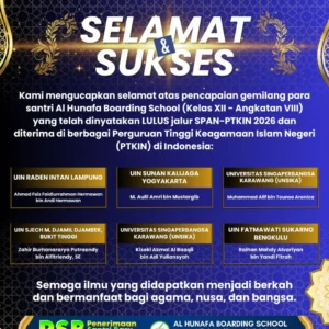 Alhunafa Boarding School adalah pilihan utama bagi mereka yang mengutamakan pendidikan yang berkualitas dan berbasis nilai-nilai Islam yang kokoh. Dengan fokus pada Aqidah dan Manhaj Sunnah, kami menghasilkan siswa yang memiliki akhlak karimah dan menghafal Al Qur’an sesuai Tajwid. Kami juga menawarkan pembelajaran bahasa Arab secara aktif dan pasif, membuka peluang luas bagi siswa untuk melanjutkan studi ke Universitas Islam dalam dan luar negeri. Mari bergabung di Ma’had Kami Al Hunafa, Baarakallahu fiikum.