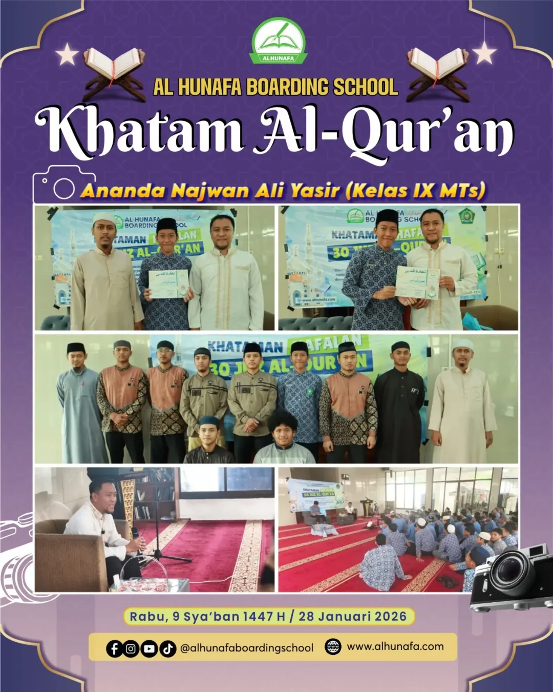 Alhamdulillah pada Hari Rabu, 28 Januari 2026 ananda Najwan Kelas IX MTs Al Hunafa telah menyetorkan hafalan terakhir dari akhir Juz 25 surat Ad Dukhan dan Al Jatsiyah. Tentunya, hal ini adalah kebanggaan bagi Kami bisa membimbing dan menghantarkan ananda hingga menyelesaikan hafalan 30 Juz dengan bacaan yang diperhatikan secara Tajwid-nya.