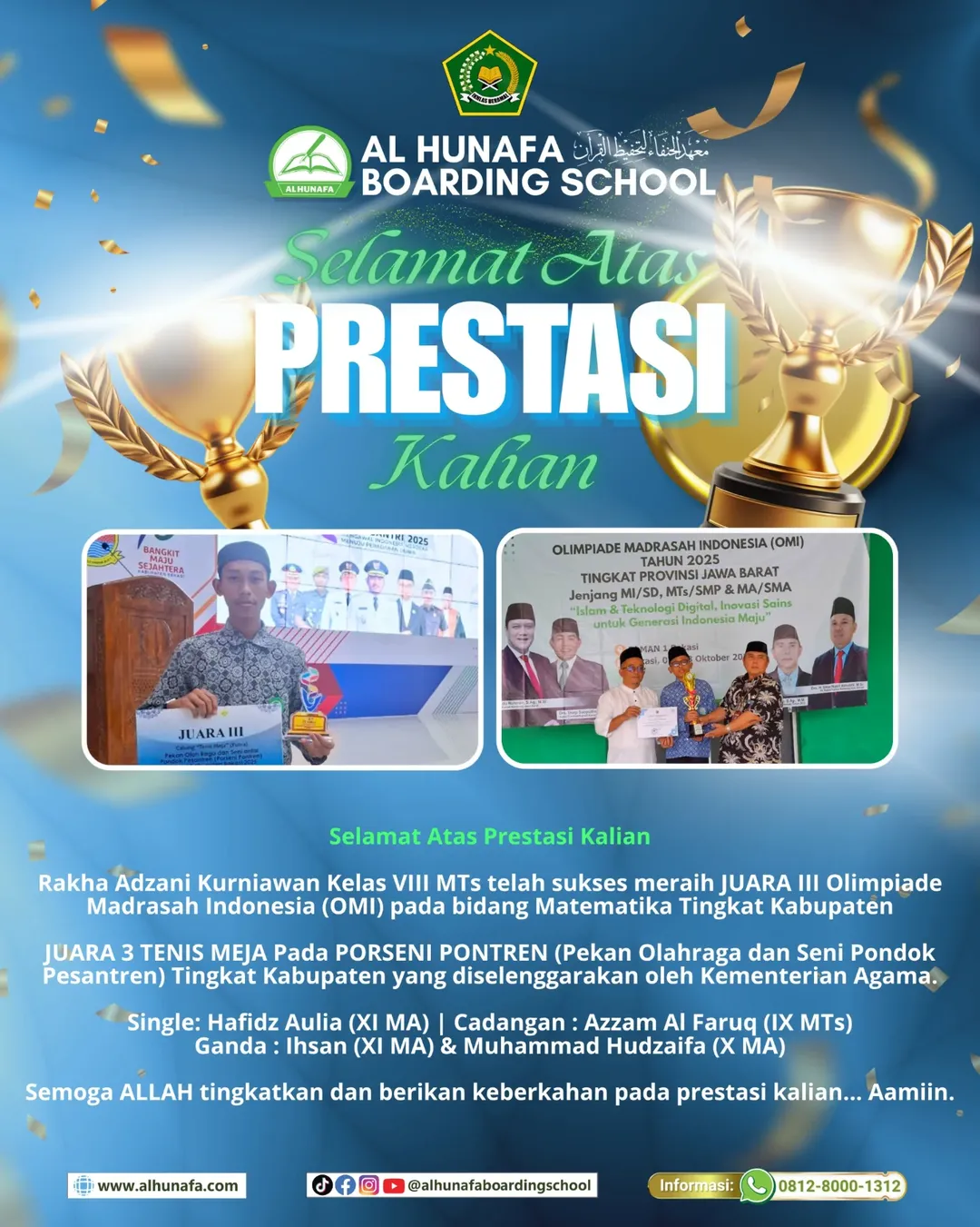 Rakha Adzani Kurniawan Kelas VIII MTs telah sukses meraih JUARA III Olimpiade Madrasah Indonesia (OMI) pada bidang Matematika Tingkat Kabupaten