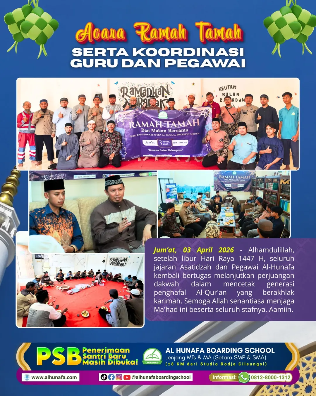 Alhamdulillah, setelah libur Hari Raya 1447 H, seluruh jajaran asatidzah dan pegawai Al-Hunafa kembali bertugas melanjutkan perjuangan dakwah dalam mencetak generasi penghafal Al-Qur’an yang berakhlak karimah. Semoga Allah senantiasa menjaga ma’had ini beserta seluruh stafnya. Aamiin.