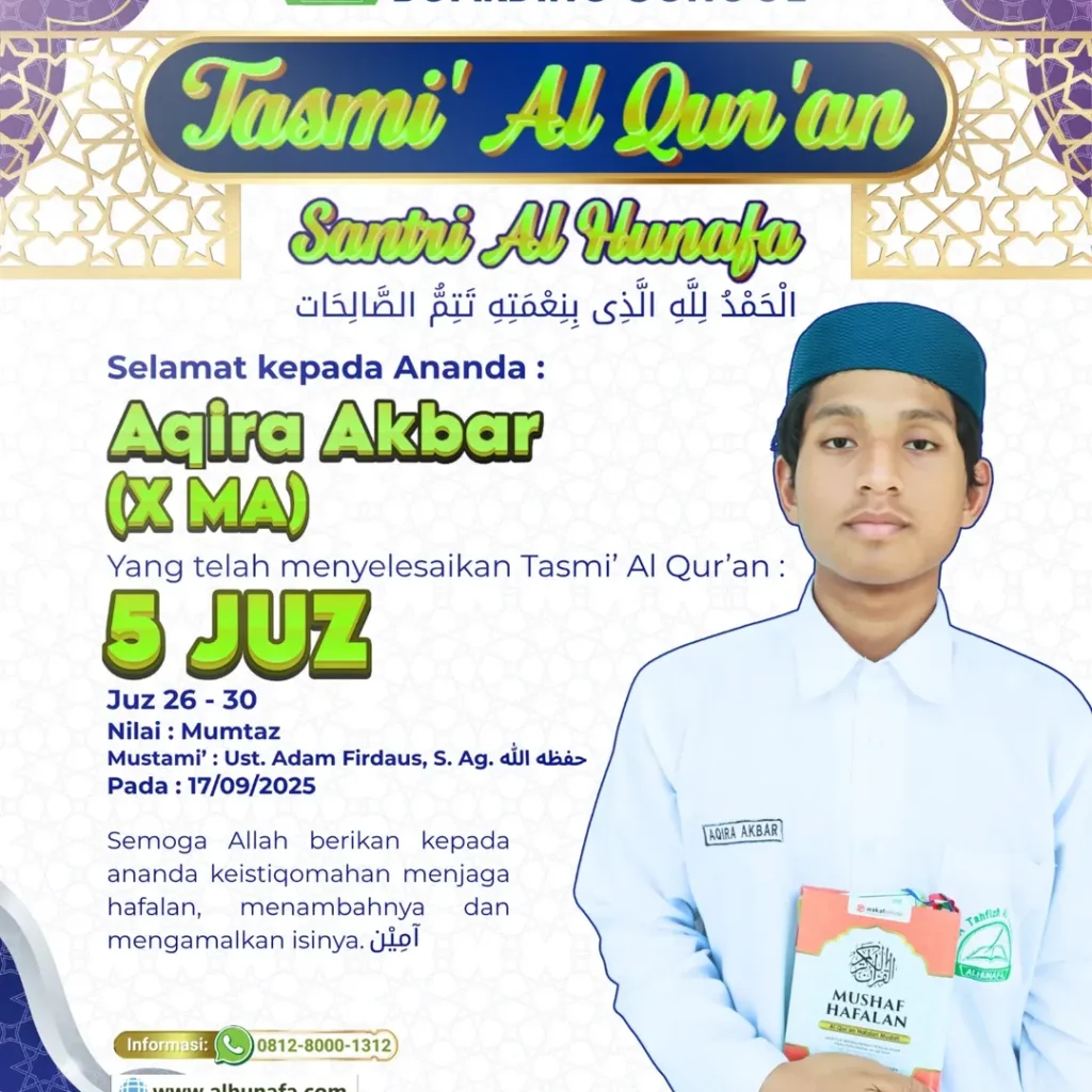 📖 Tasmi’ Al Qur’an Santri Al Hunafa الحمدلله الذى بنعمته تتم الصالحات Selamat kepada ananda: Aqira Akbar (X MA) Yang