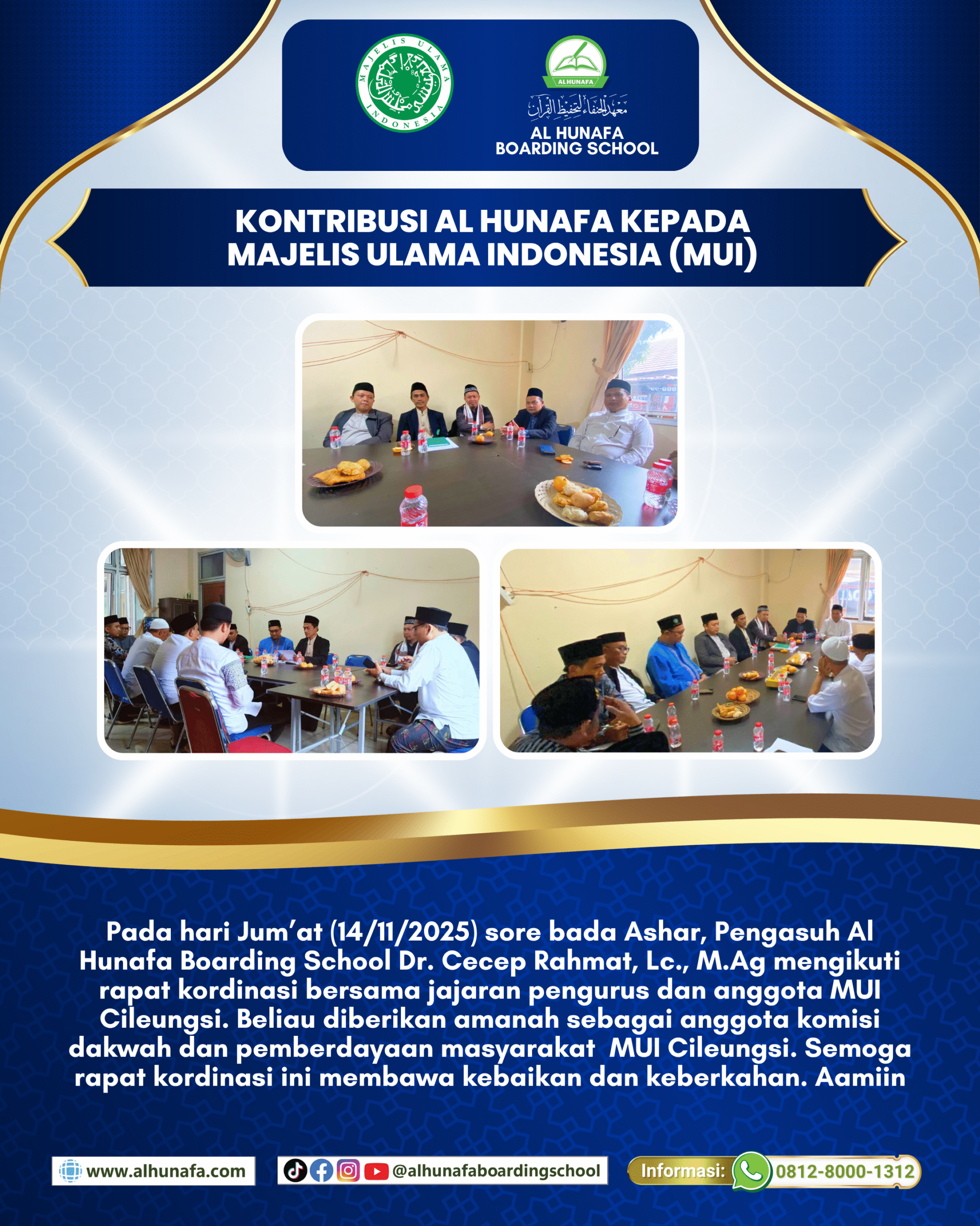 Pada hari Jum’at (14/11/2025) sore bada Ashar, Pengasuh Al Hunafa Boarding School Dr. Cecep Rahmat, Lc., M.Ag mengikuti rapat kordinasi bersama jajaran pengurus dan anggota MUI Cileungsi. Beliau diberikan amanah sebagai anggota komisi dakwah dan pemberdayaan masyarakat MUI Cileungsi. Semoga rapat kordinasi ini membawa kebaikan dan keberkahan. Aamiin