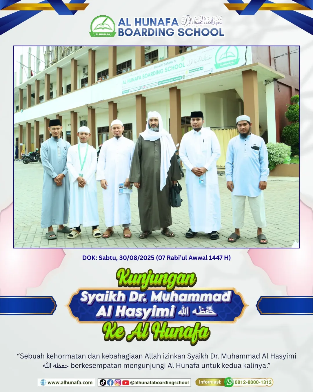Sebuah kehormatan dan kebahagiaan pada Sabtu, 30 Agustus 2025 / 7 Rabi’ul Awwal 1447 H Allah izinkan Syaikh Dr. Muhammad Al Hasyimi حفظه الله berkesempatan mengunjungi Al Hunafa untuk kedua kalinya. Sebelumnya, pada Oktober 2024 silam beliau sempat berkunjung ke Al Hunafa dan menyampaikan Kajian dengan tema “Wasiat Untuk Para Penuntut Ilmu”.